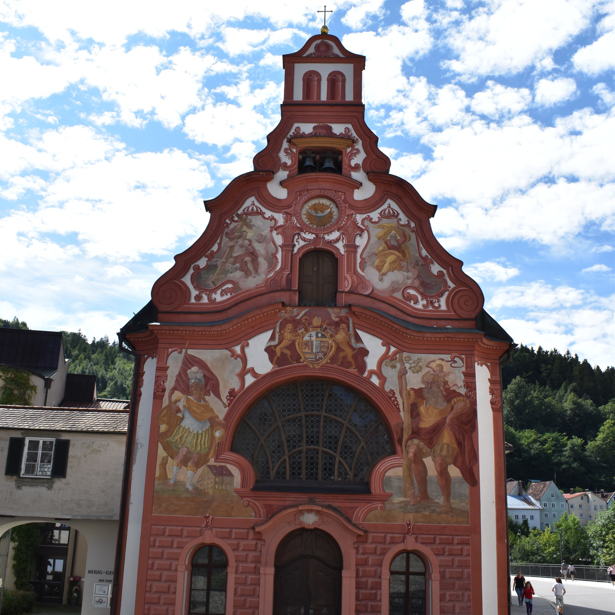 A Fussen troverete la piccola Chiesa Spitalkirche o Chiesa dello Spirito Santo, i suoi colori accesi spiccano sulla città, per poterla vedere internamente dovete vedere gli orari delle funzioni.
